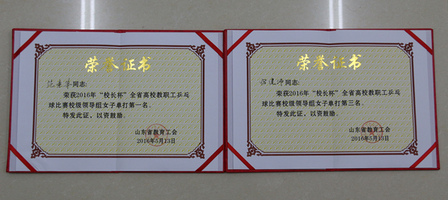 5月10日至13日,2016年“校长杯”全省高校教职工乒乓球比赛于在山东农业大学体育训练馆举行。由校长范素华和党委副书记宿建沛率领的山东女子学院代表队参加了比赛。队员们充分发扬团结拼搏的精神,胜不骄败不馁,赛出了水平,赛出了风格。经过激烈的角逐,范素华和宿建沛分获校级领导组女子单打第一名和第三名的好成绩,我校代表队荣获比赛体育道德风尚奖。